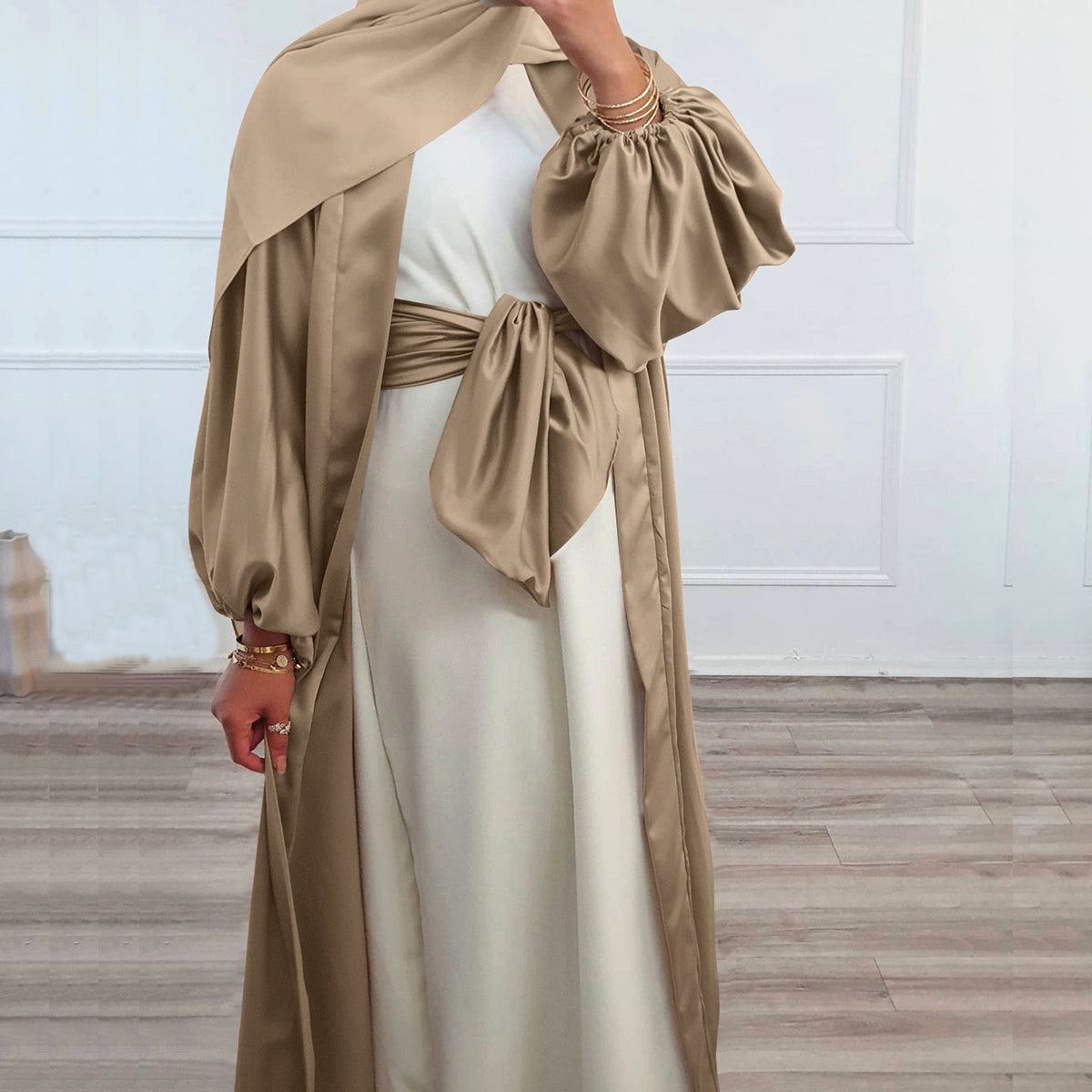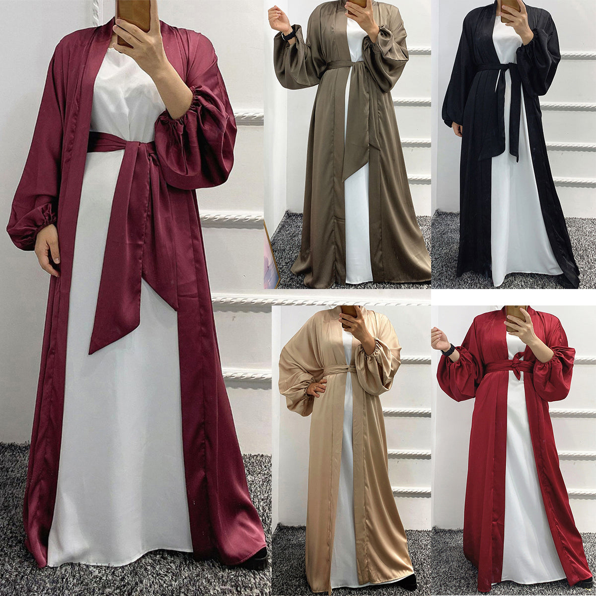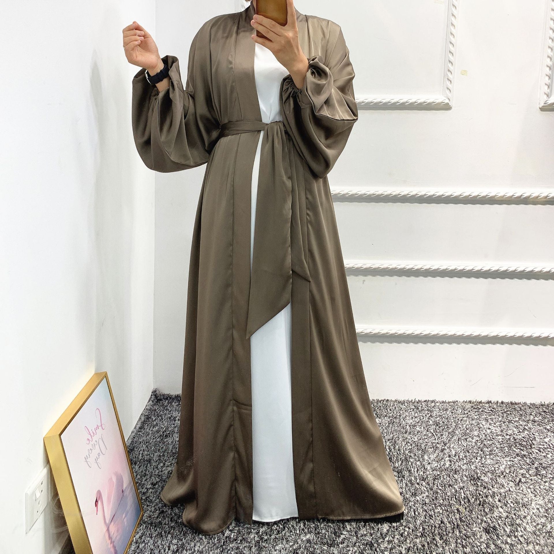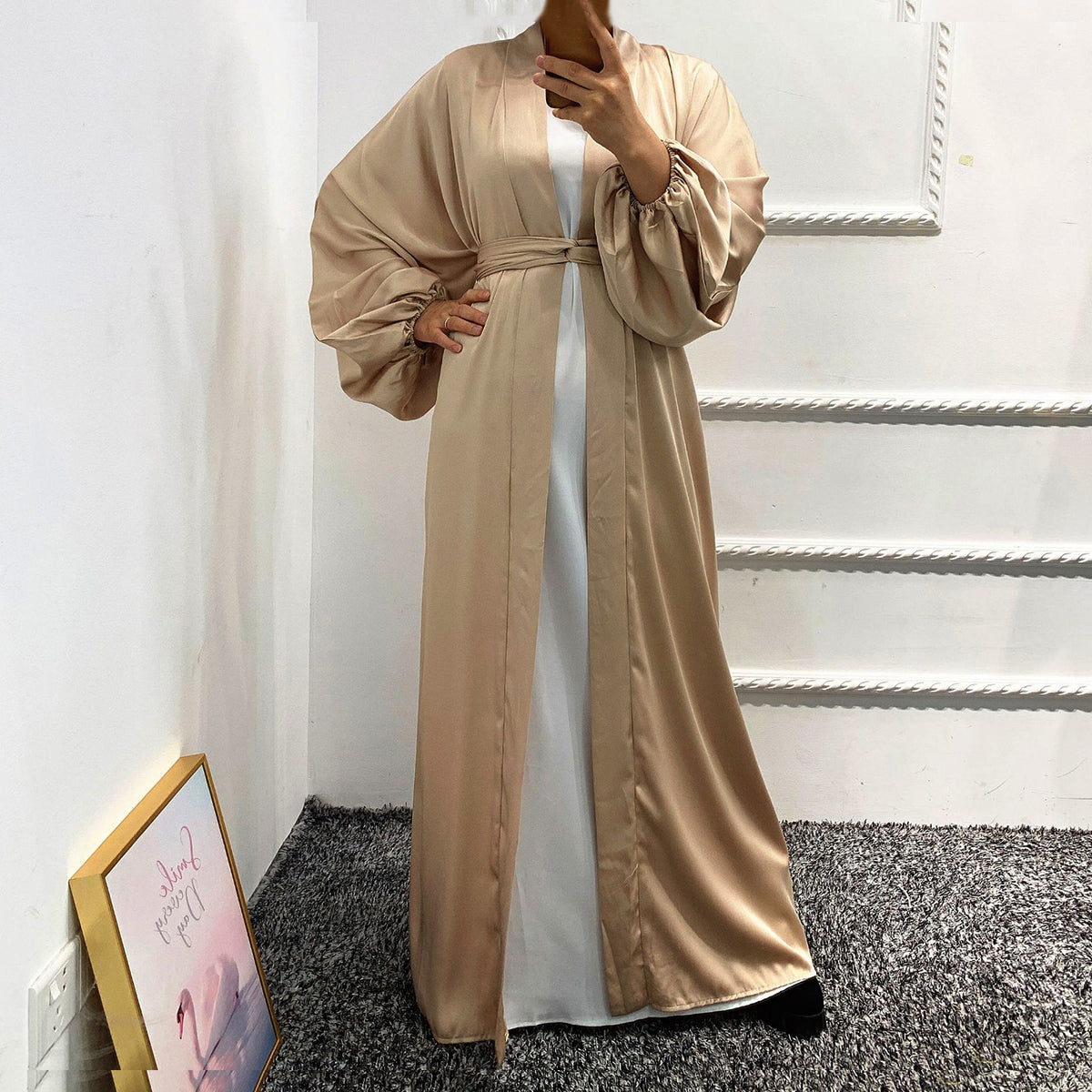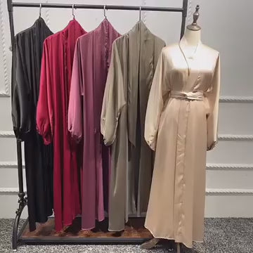 #431 bubble sleeved cardigan satin open abaya with belt