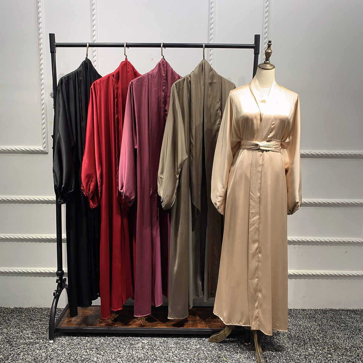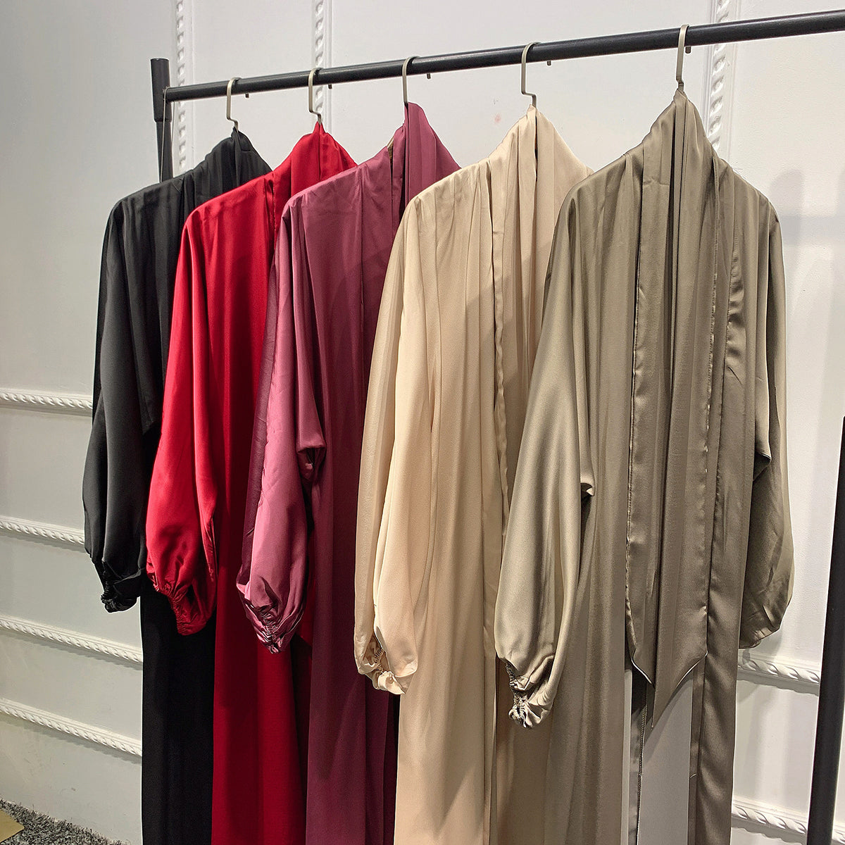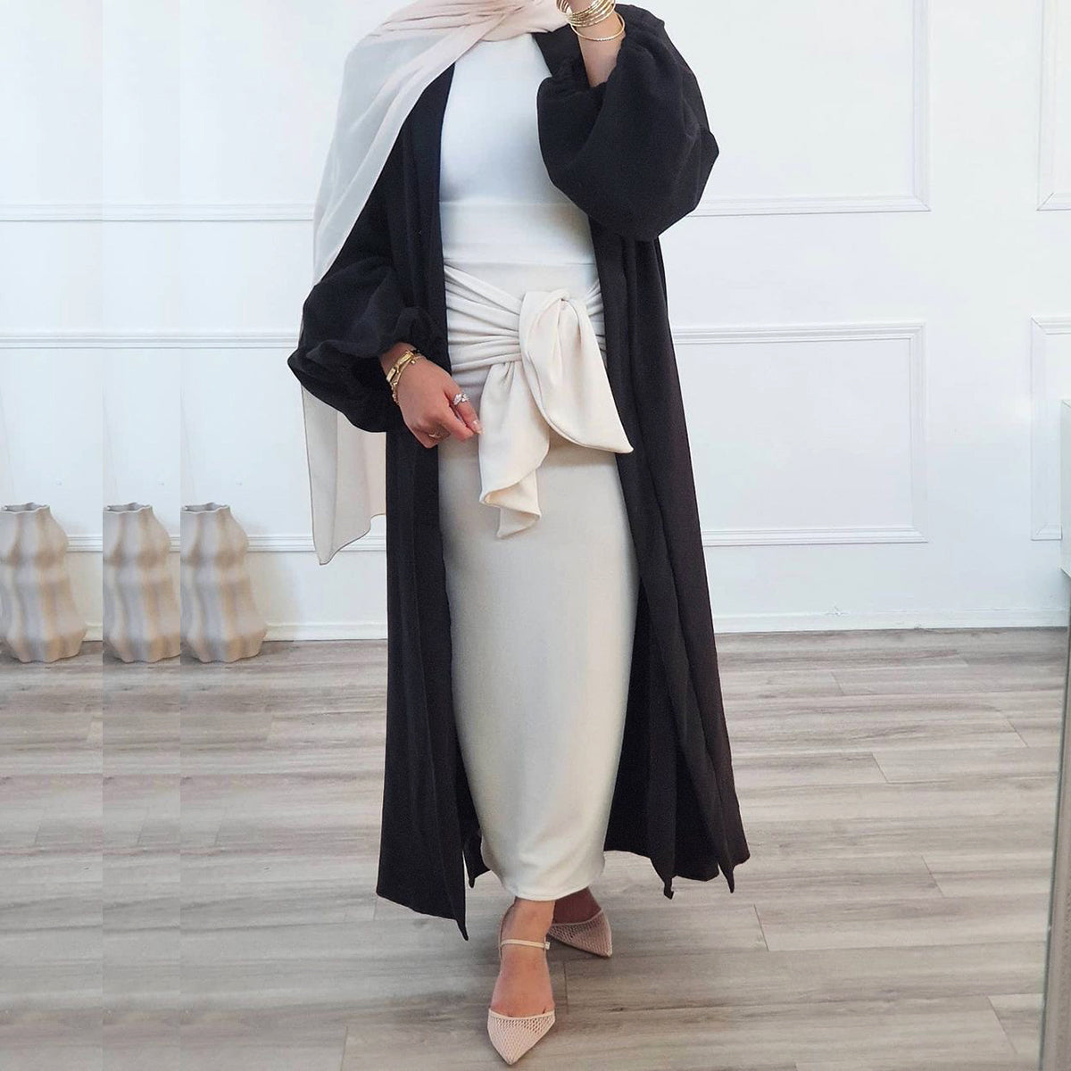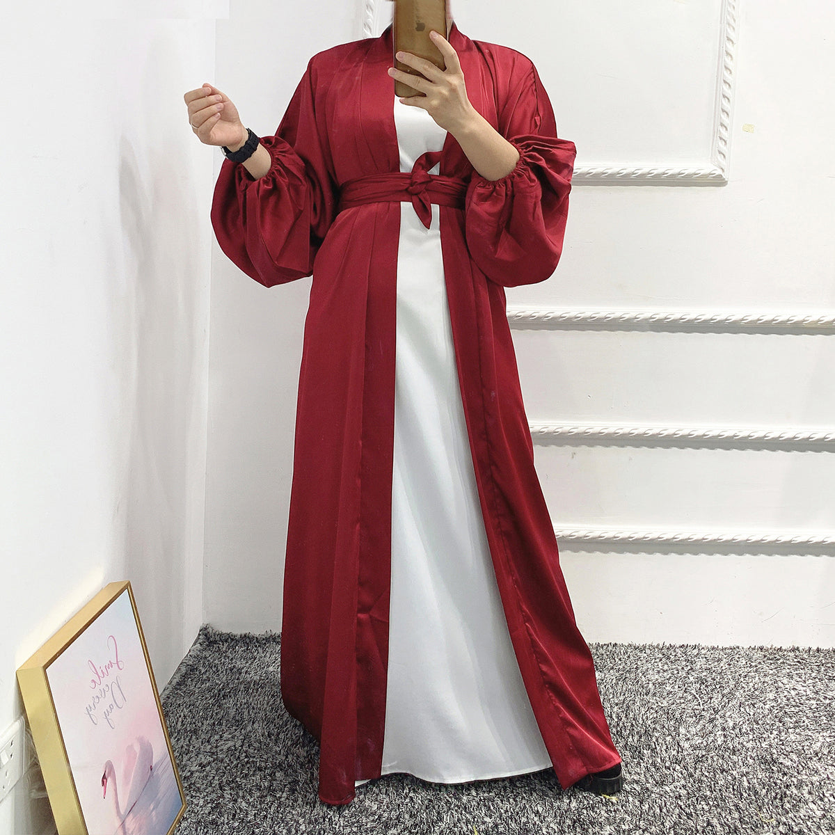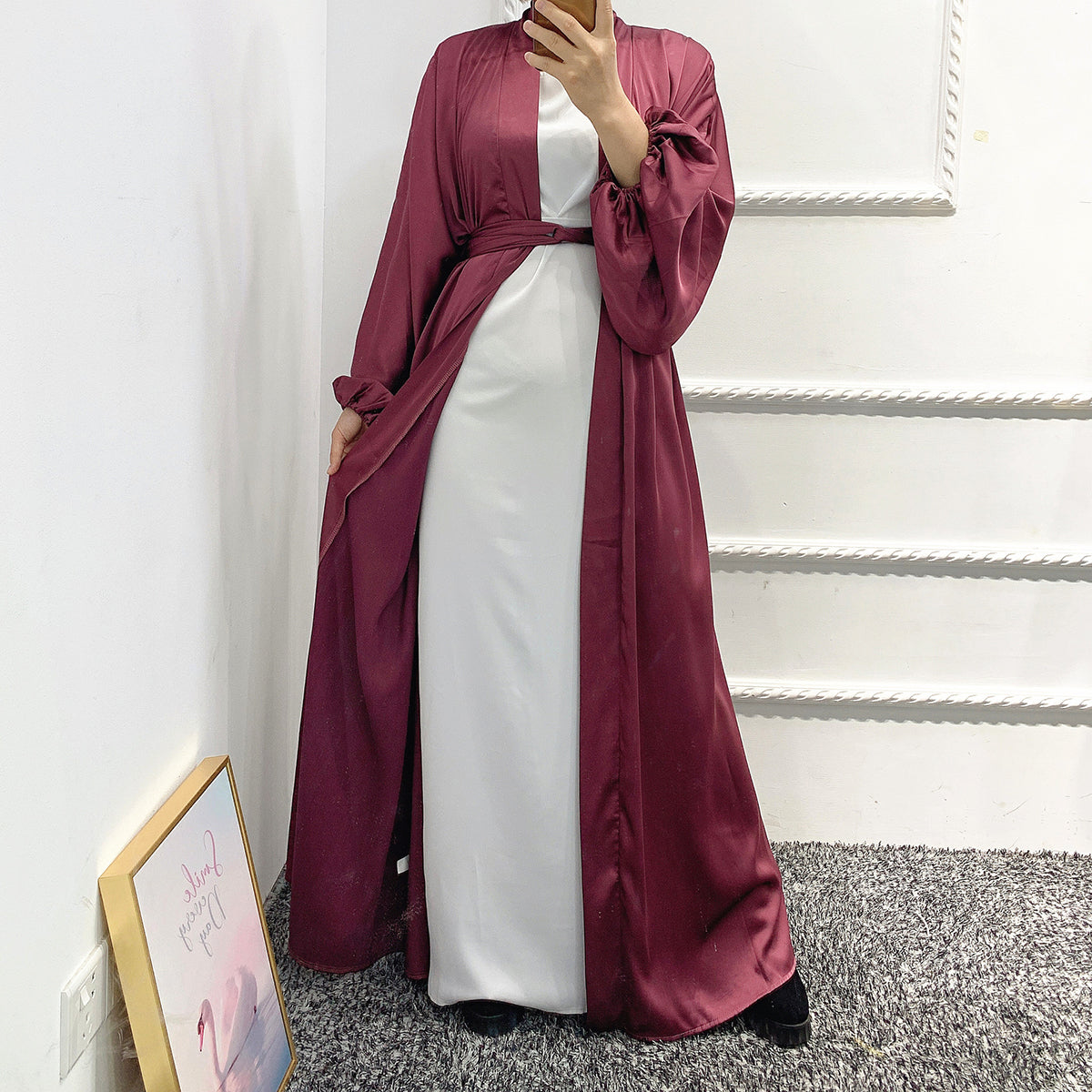 #431 bubble sleeved cardigan satin open abaya with belt